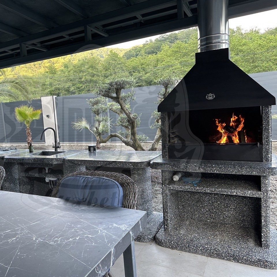 Интегрируя в себя четыре практичных модуля: мощную печь барбекю “Гранд” с топкой шириной 82 см, стол с роскошной каменной мойкой “Гранд”, разделочный стол 1100х700 мм и печь под казан, этот комплекс предлагает полную автономию приготовления пищи на открытом воздухе.